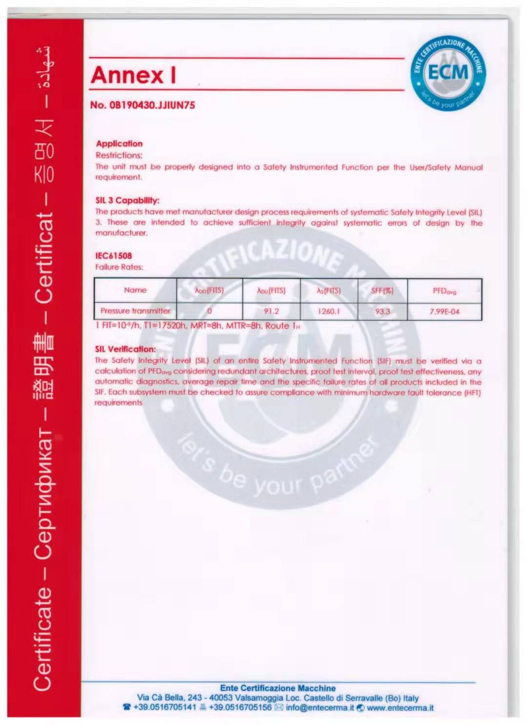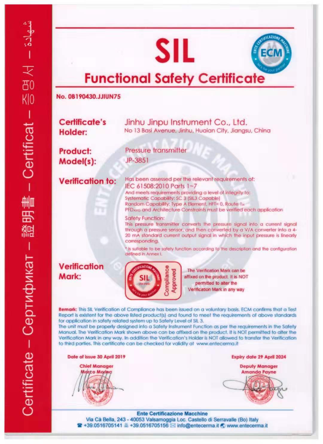 以下圖片為金湖金普儀表獲得的SIL2認(rèn)證,該證書證明了變送器質(zhì)量優(yōu)秀,獲得廣大用戶認(rèn)可。