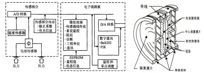 微差壓變送器由智能傳感器和智能電子板兩部分組成,智能傳感器部分包括:電容式傳感器、測量膜片檢測電路、溫度傳感器和溫度補(bǔ)償電路等組成;智能電子板板部分包括:微電腦控制器及外圍電路組成,完成壓力信號到4~20mADC的轉(zhuǎn)換。