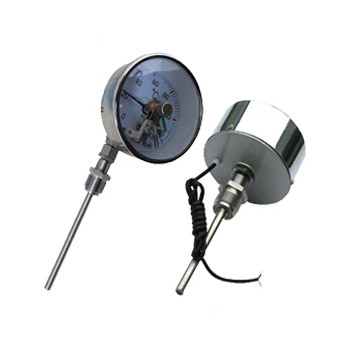 電接點(diǎn)雙金屬溫度計(jì)是基于繞制成環(huán)性彎曲狀的雙金屬片組成。一端受熱膨脹時(shí),帶動(dòng)指針旋轉(zhuǎn),工作儀表便顯示出熱點(diǎn)勢所應(yīng)的溫度值。