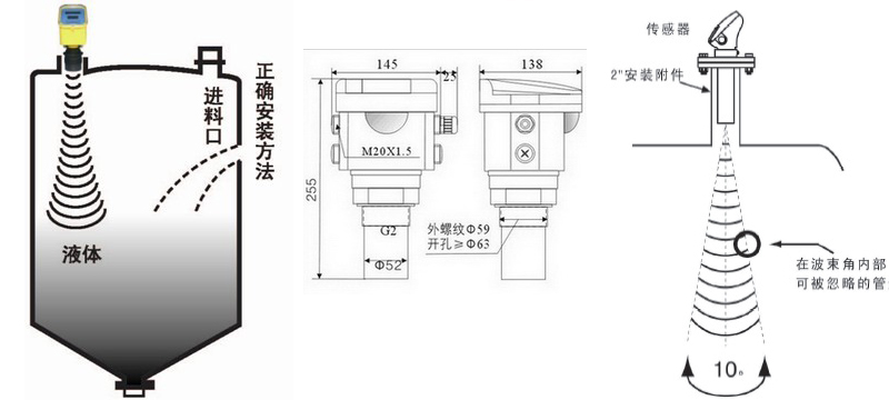 四、超聲波液位計外形尺寸圖及安裝示意圖: