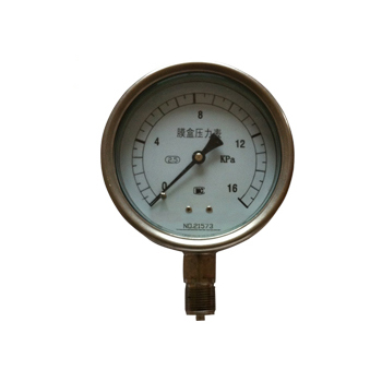 不銹鋼膜盒壓力表由測(cè)量系統(tǒng)(包括接頭,波紋膜盒等),傳動(dòng)機(jī)構(gòu)(包括拔桿機(jī)構(gòu),齒輪傳動(dòng)機(jī)構(gòu)),指示部件(包括指針與度盤)和外殼(包括表殼、襯圈和表玻璃)所組成。