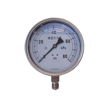膜盒耐震壓力表由測量系統(tǒng)(包括接頭膜盒等)、傳動(dòng)機(jī)構(gòu)、指示裝置和外殼組成。當(dāng)被測介質(zhì)的壓力作用于膜盒時(shí),其自由端產(chǎn)生相應(yīng)彈性變形一位移,經(jīng)撥桿帶動(dòng)傳動(dòng)機(jī)構(gòu)放大,由指示裝置將被測壓力在儀表盤上指示出來,且表內(nèi)充油,達(dá)到耐震的效果。